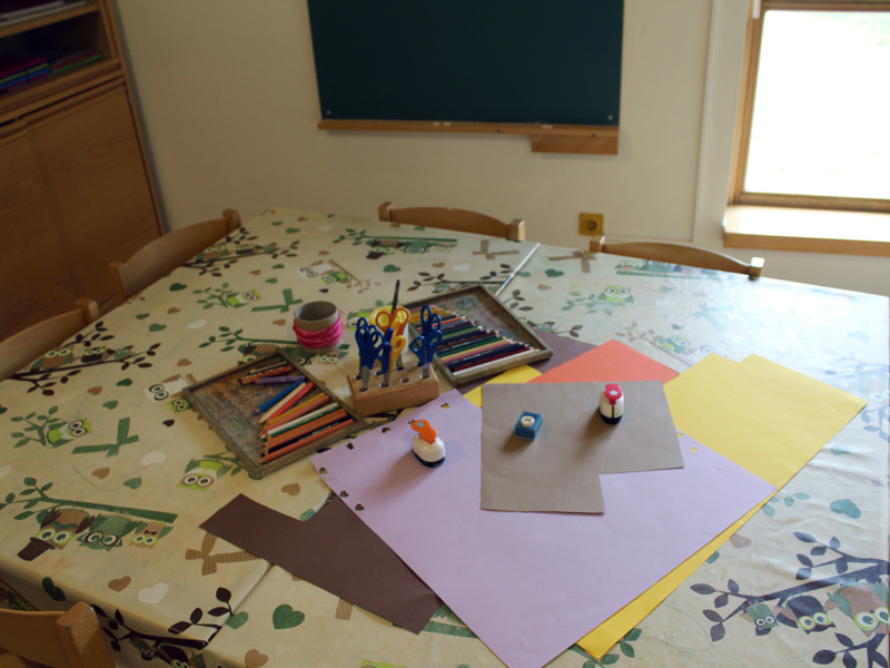 Der Gruppennebenraum wird von allen drei Gruppen hauptsächlich als Mal- und Bastelzimmer genutzt. Die Kinder können durch das entsprechende Platzangebot somit viele Bastelmaterialien kennen lernen und kreativ tätig werden. Im Umgang mit den Materialien werden vorrangig die Kleinmotorik und die Selbstaktivität angeregt.